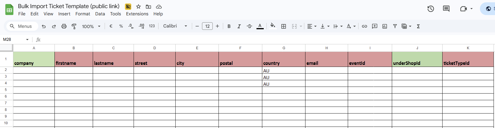 - Columns highlighted in red are mandatory and must not be deleted, if these are unknown, we suggest using the event details and completing each line accordingly.