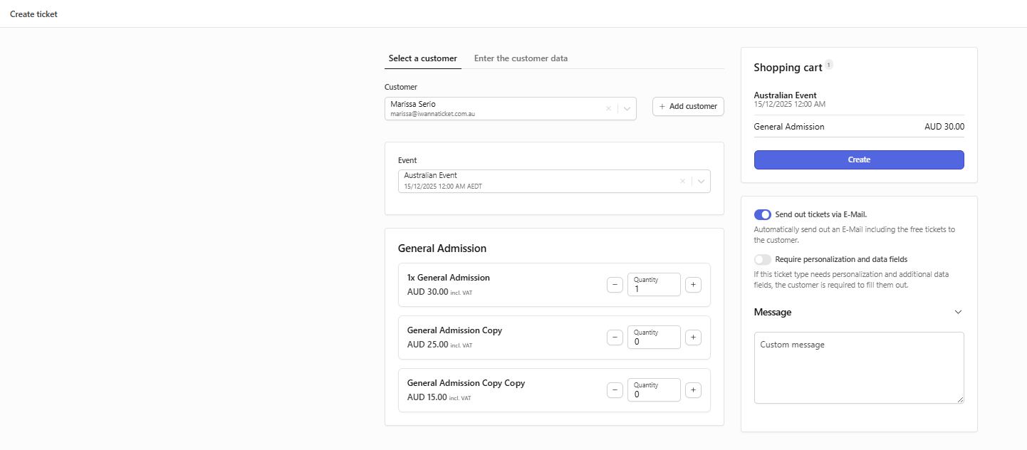 With free tickets you can give customers the opportunity to get access to your events for free and without any payment process. The tickets are generated in the dashboard and can be sent directly to the customer with one click. Free tickets set the ticket price of existing ticket types to $0.