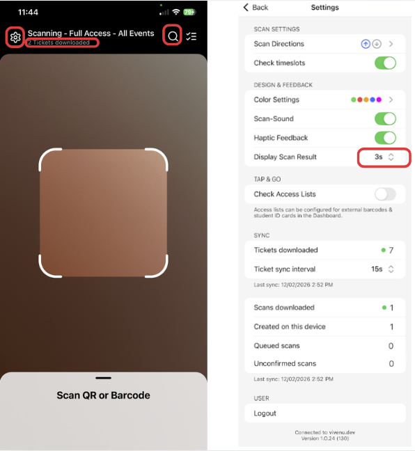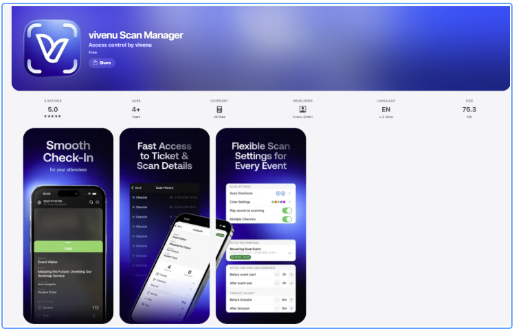 Ticket scanning for events is handled via the dedicated vivenu Scan Manager app, available as a free download on iOS and Android. The app enables fast QR code and barcode scanning, supports offline mode, provides real-time check-in monitoring, and allows manual attendee lookup by last name. It’s built for high-volume events and secure, reliable access control.