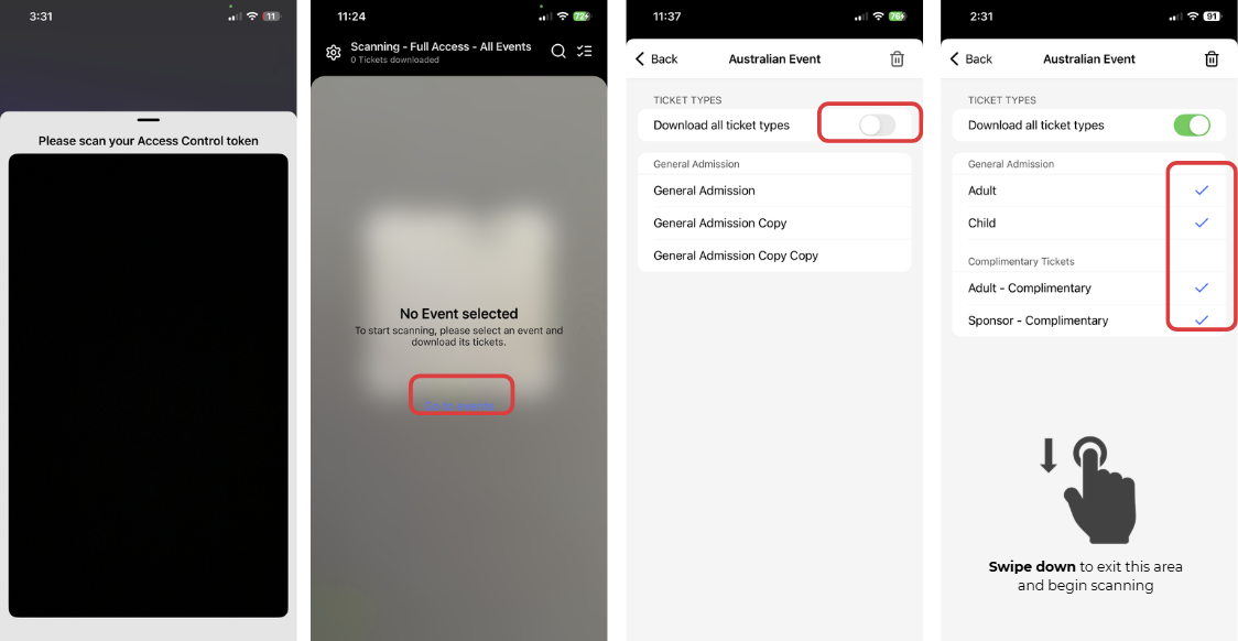 - Next, a list of all available ticket types will appear. We recommend toggling on Download All Ticket Types, a blue tick will appear next to each ticket type, then click back. If you wish to download only a particular ticket type, you can do so, but this will prevent other ticket types from being scanned.