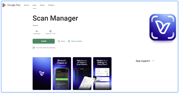 - Download the vivenu Scan Manager app from the appropriate app store onto your smartphone.