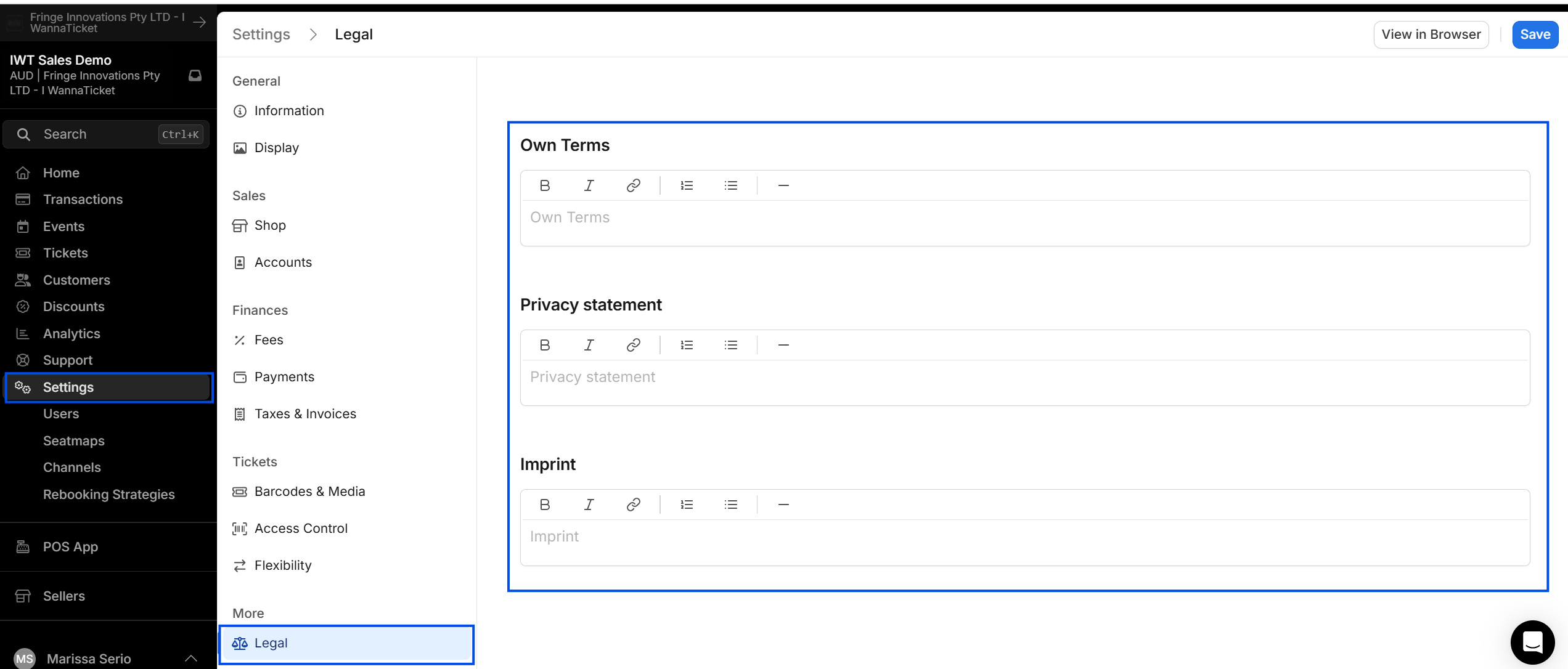- Enter your Own Terms, Privacy Statement and/or Imprint directly or add a URL to direct to exsisting policies.