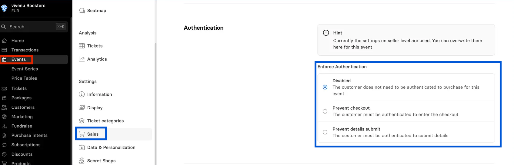 Attention: If Multi-Event Checkout is enabled in your shop, the authentication settings can only be set on a seller level and not be configured differently per event.