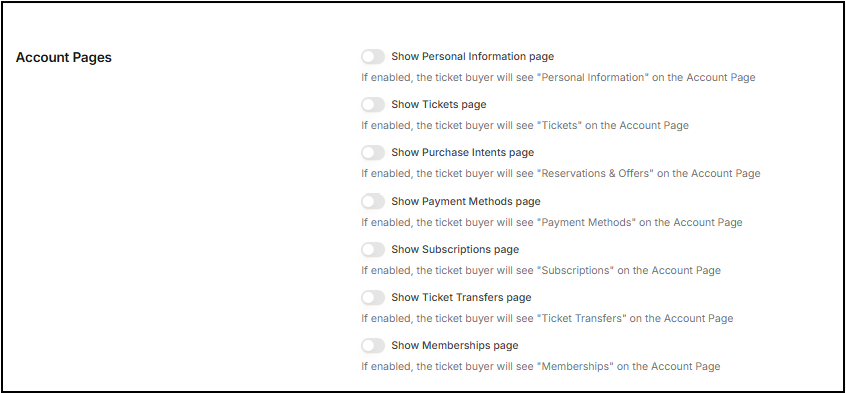 Only showing pages that are relevant to your shop set-up. Example: only toggle on the Show Ticket Transfers page if ticket transfers are allowed in your shop.