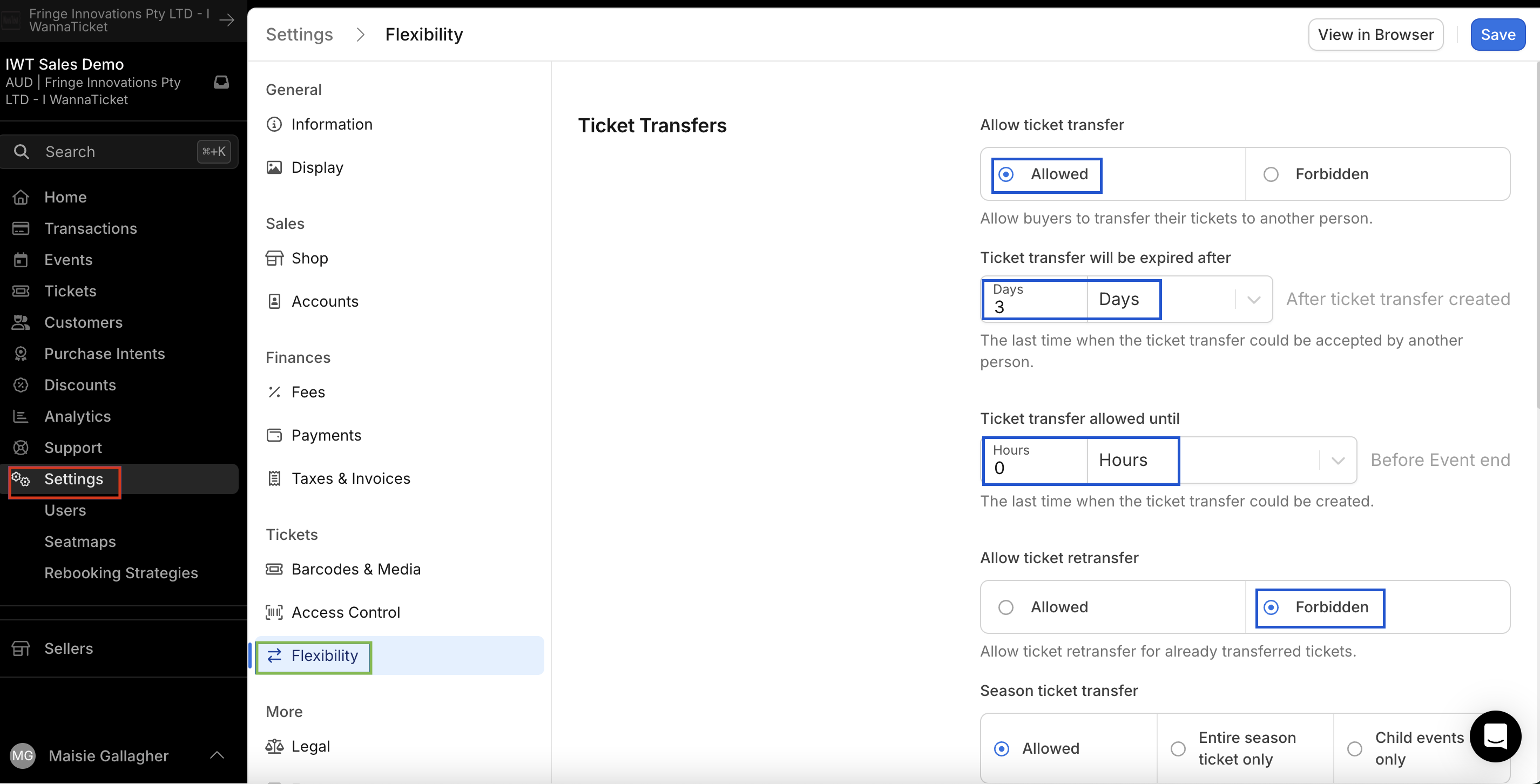 - Configure ticket transfer and ticket retransfer settings accordingly
