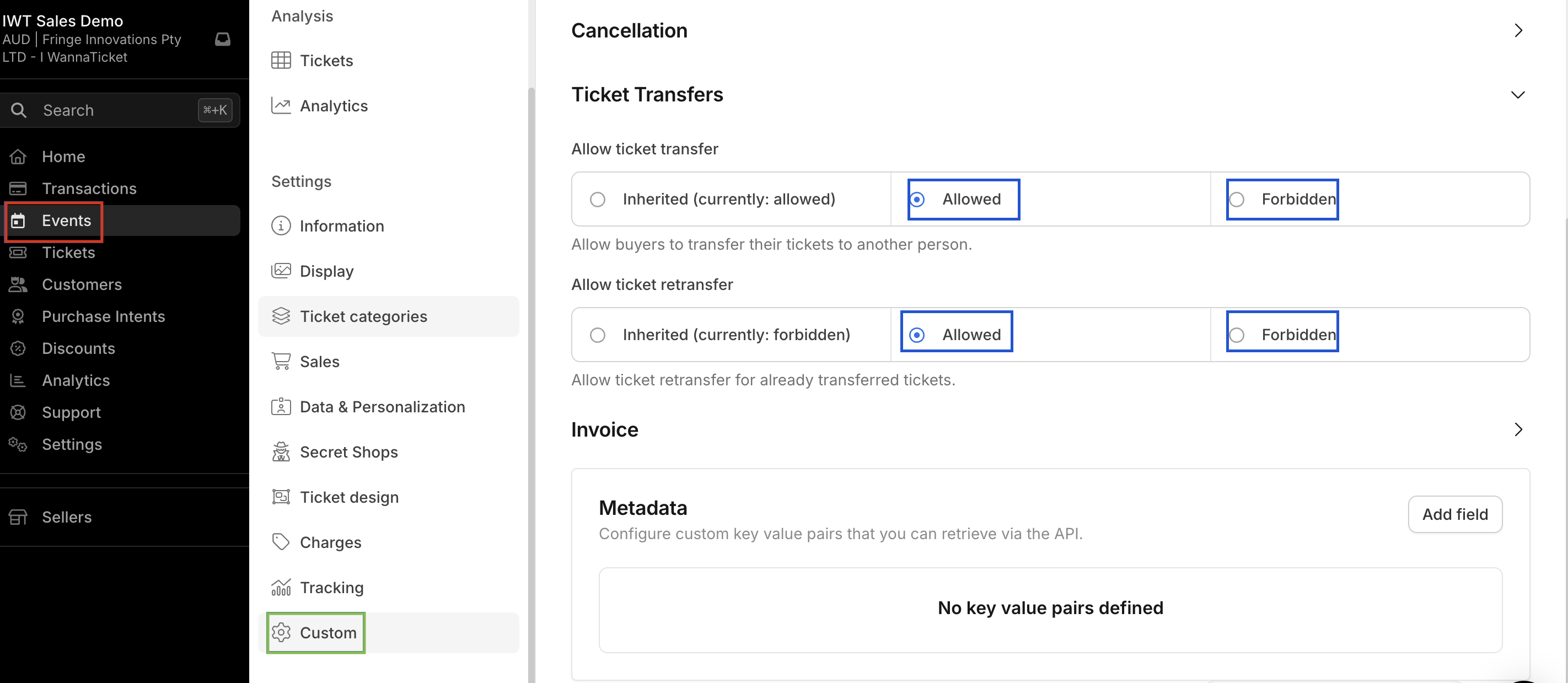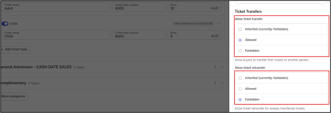 - Choose whether transferred tickets can be retransferred (Allowed or Forbidden)