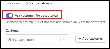 *If an existing customer is selected or a new customer is created, the recipient will receive an email invitation to confirm the transfer. The email confirmation can be disabled to complete the transfer immediately by toggling this off.