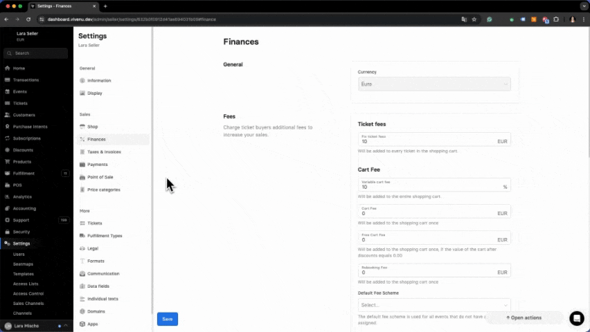 - Seller Level (account level) - Standard fees can be set at the account level, applying to all events. This setting forms the top-level and can be overridden by subsequent levels. You can find this setting under the Settings and Finance modules.