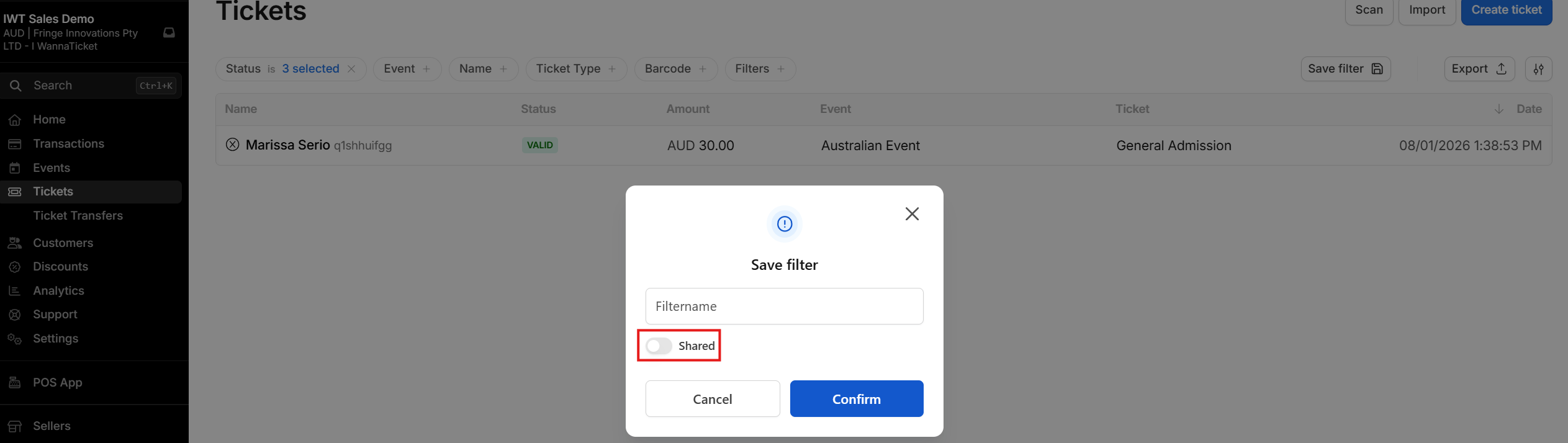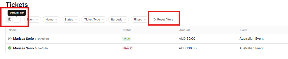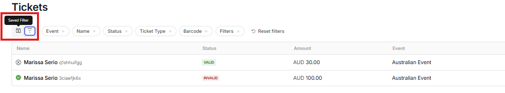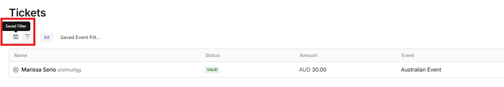 - Use the filters in the top menu to create your desired list (for example, by selecting a specific event or ticket type).