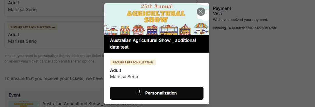 By default, the personalisation process occurs after the initial checkout, allowing the ticket purchaser to enter the names and/or any required checkout fields at their convenience without any interruptions during the booking process.