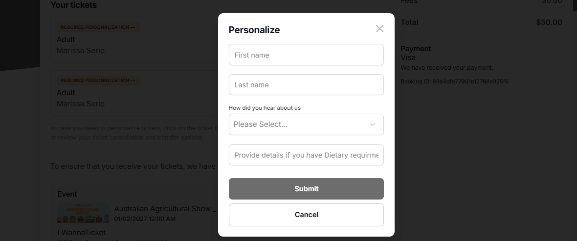 This help article may assist customers (ticket buyers) in completing optional or required personalisation and ticket details. It also provides sellers (event organisers) with guidance on how these details are completed.