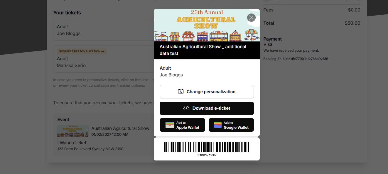 Note: If you have set personalisation as mandatory, tickets cannot be downloaded, stored, or printed until this step has been completed. Consequently, the barcode will not be visible without completing the personalisation process. This ticket status will be visualised in the backend as Detailsrequired.