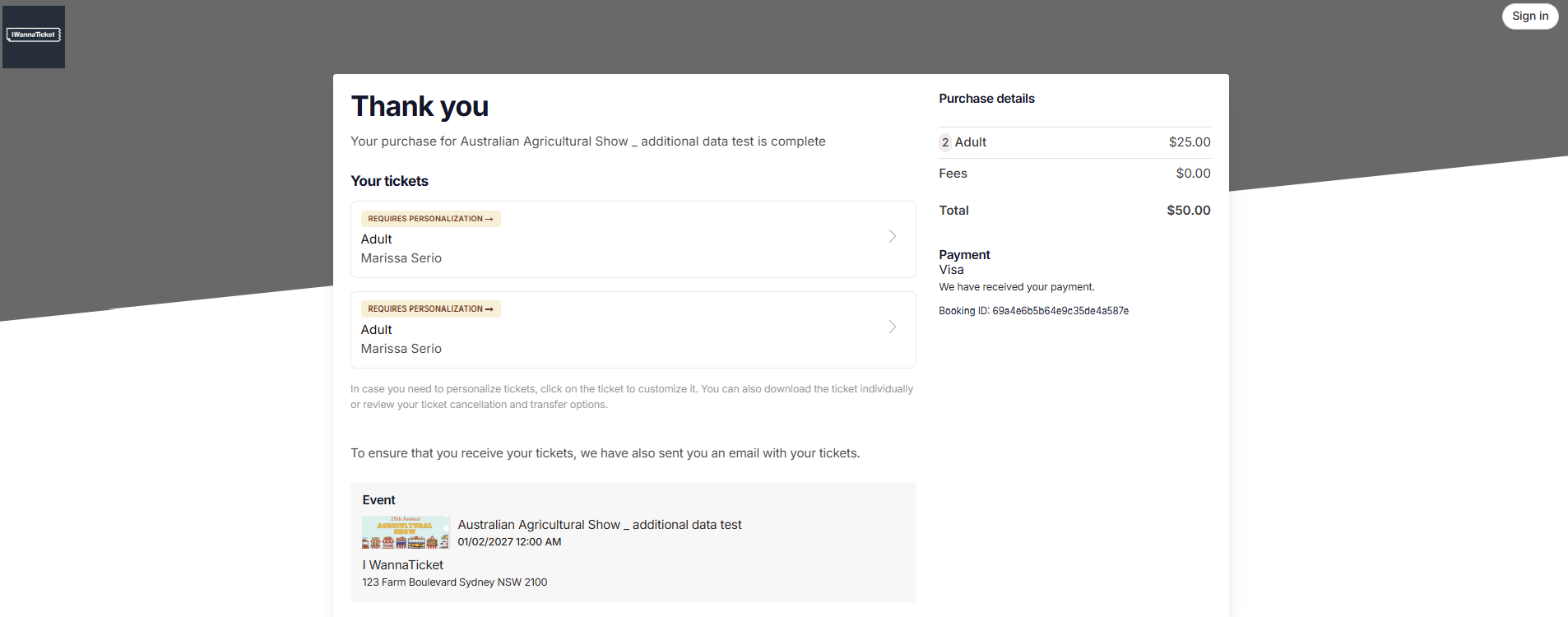 - Post checkout, the order confirmation page will display all tickets purchased. Any tickets that require personsalistion will be clearly highlighted in orange and marked as Requires Personalisation