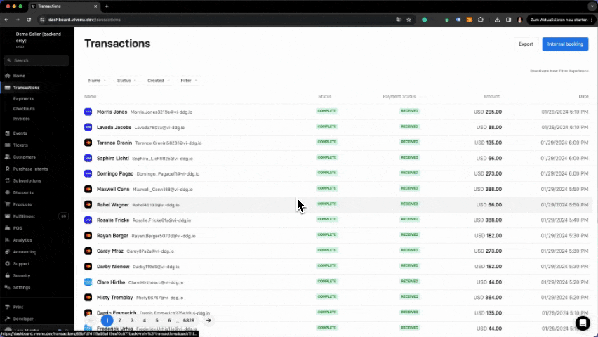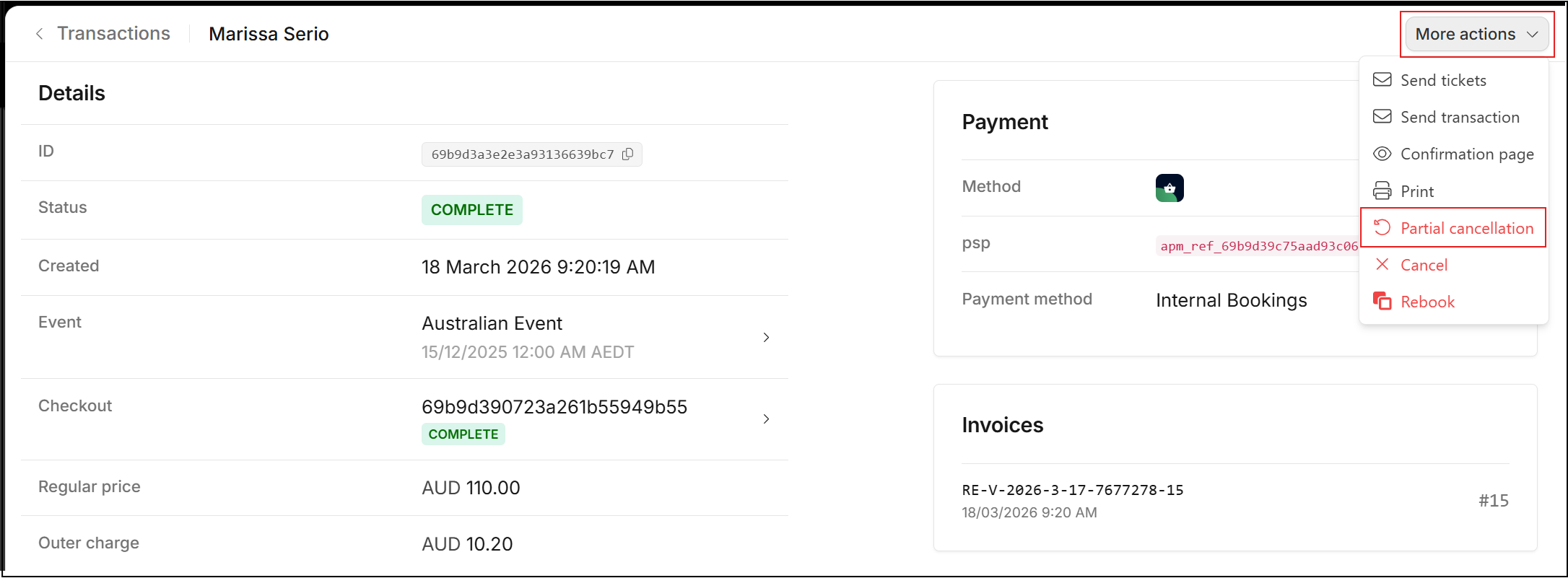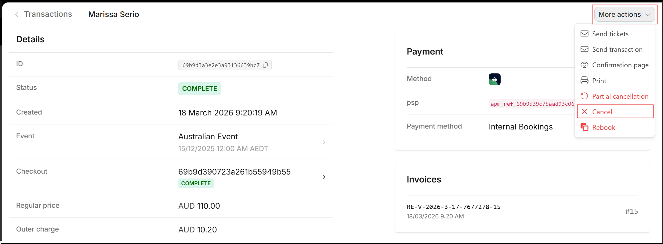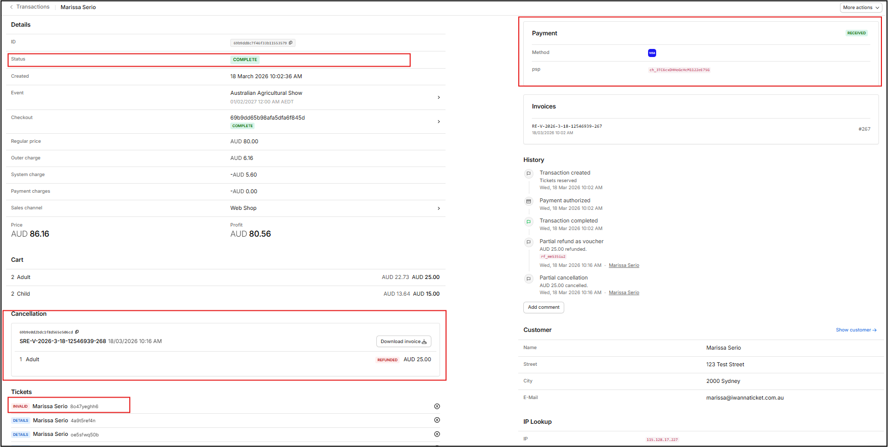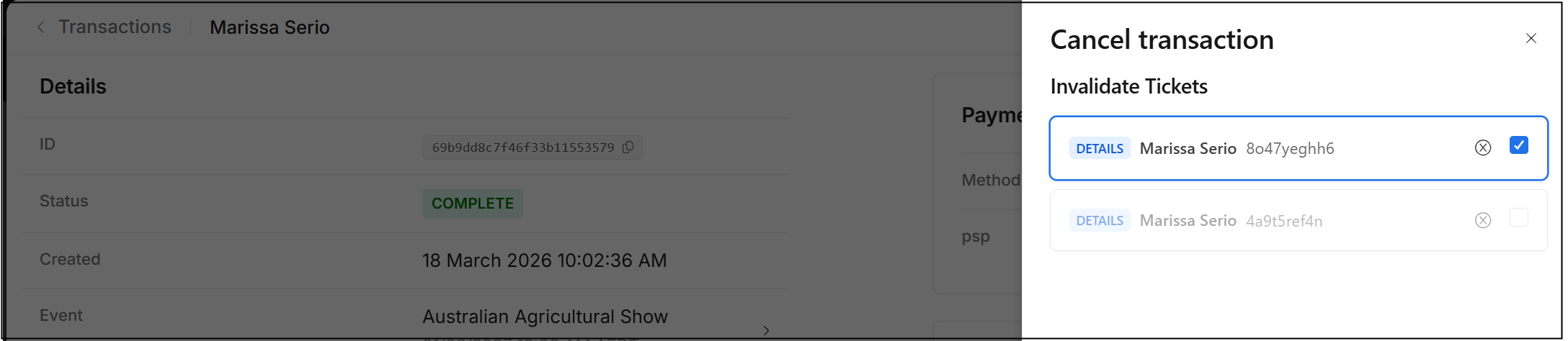 In the Transaction record, the Status remains as Complete, Payment remains as Received, however the relevant Tickets are set to Invalid. In addition, a cancelation invoice can be downloaded.