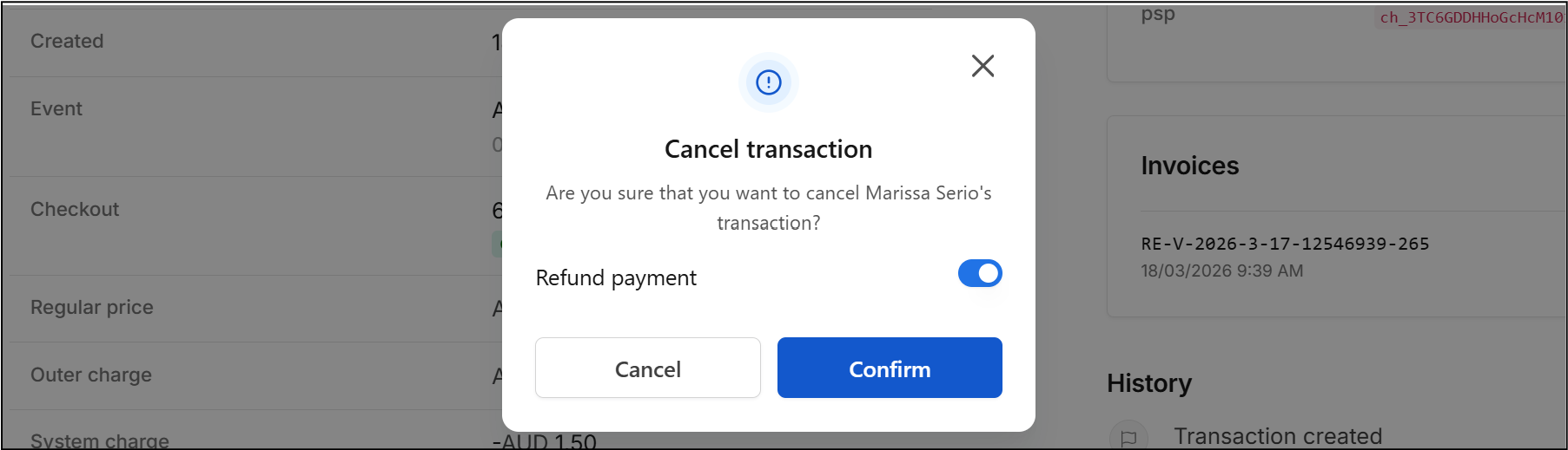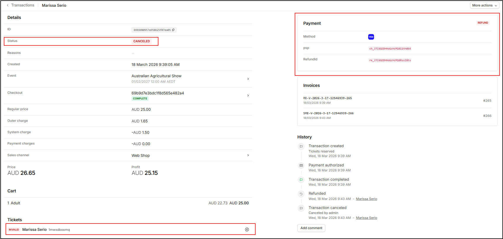 In the Transaction record, the Status is set to Cancelled, Payment is marked as Refund and Tickets are Invalid.