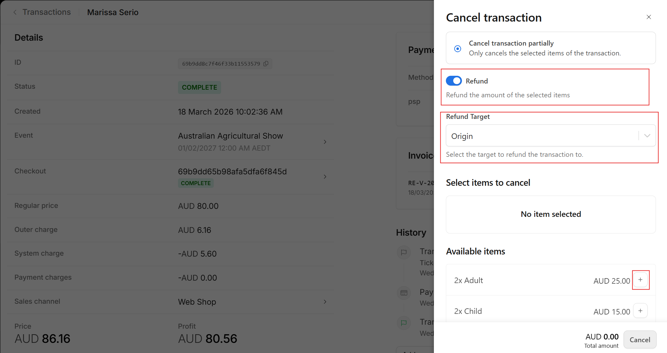 - Select the items you would like to cancel and/or refund. You can choose specific seats and/or fees by clicking the + button next to each item.