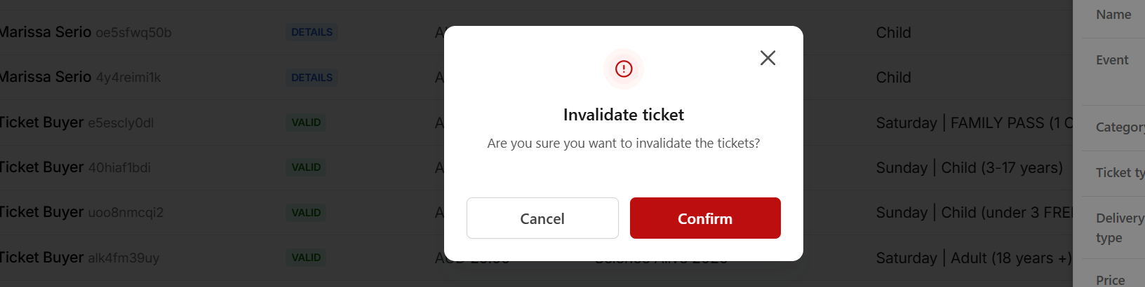 As free tickets do not create a transaction, tickets can only be invalidated (cancelled) directly from the Tickets module. If you require assistance cancelling and/or refunding a paid order —please refer to the relevant article for further guidance.