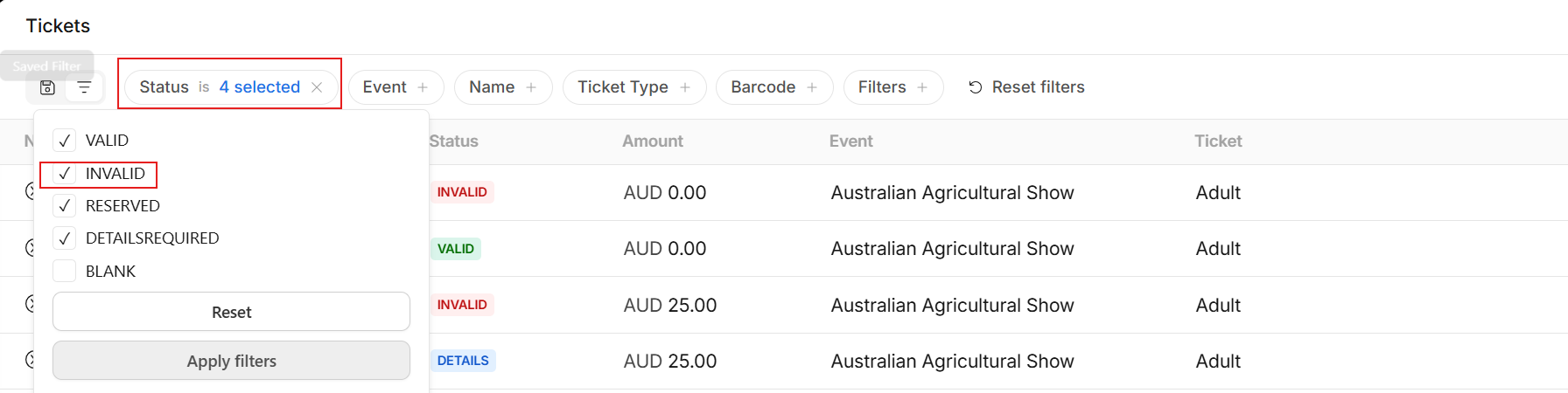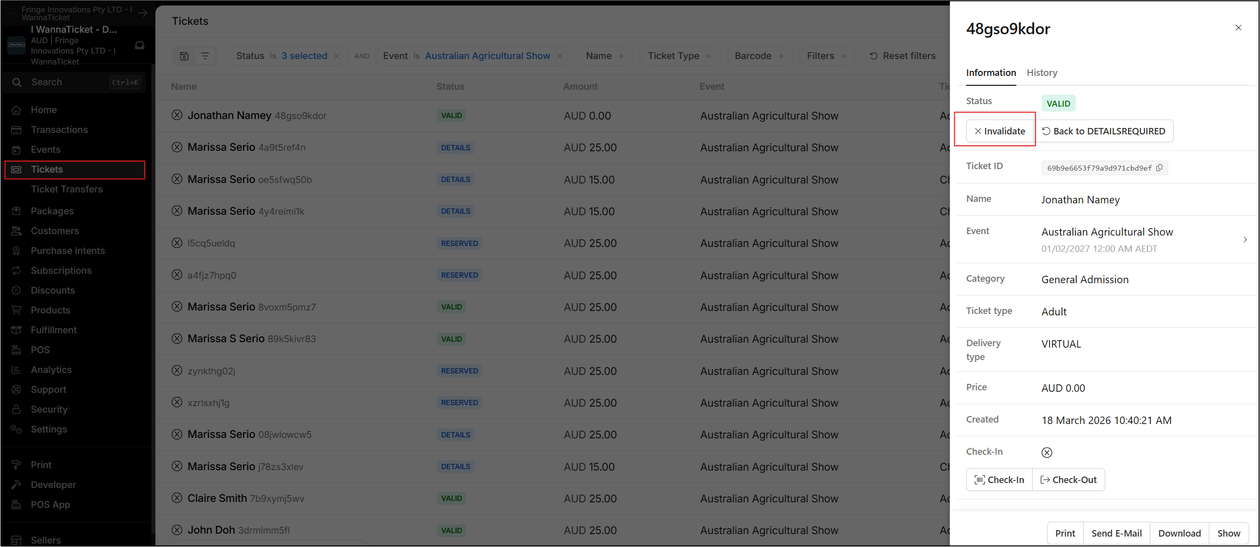 To locate a ticket marked as invalid, go to the Status filter in the Tickets module and tick INVALID to display these tickets. Once you have opened the invalid ticket, you can click Validate to change its status back to Valid.