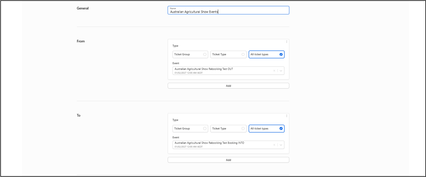 Pro Tip: It's best to set up self-service rebooking at the event level and only modify settings for specific ticket types as needed.