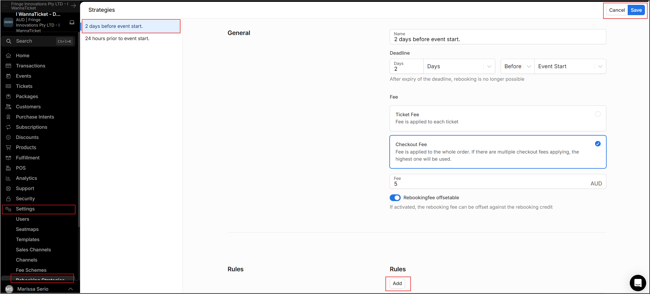 - Toggle on or off if you would like the rebooking fee to be offsetable (refer to the summary for further detail)