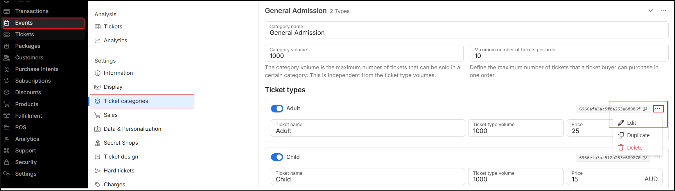 - Open the Event, click Ticket Categories (from the event menu). Open the ticket type settings for the desired ticket (access the ticket type settings by clicking edit from the 3 dot icon)