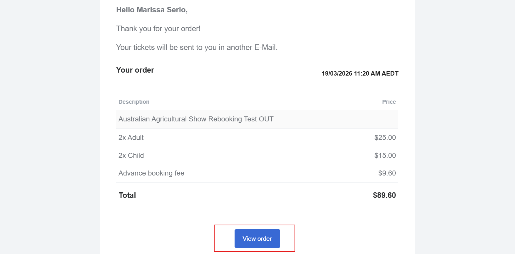 - Find your order confirmation email (separate from your ticket email), which includes your order summary.