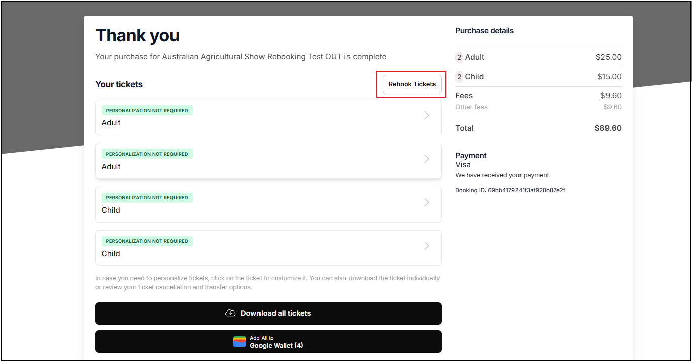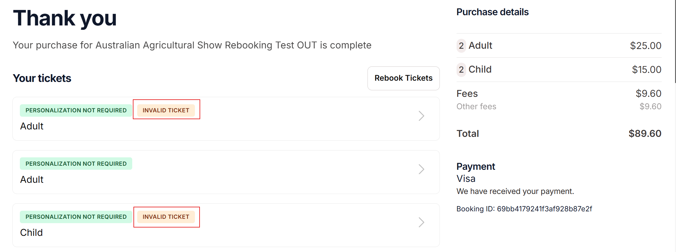 Important: Once you have completed your rebooking, the original order confirmation page will now display the rebooked tickets as INVALID TICKET. These remain for record purposes only and can no longer be used or scanned. Any tickets from the original order that were not re-booked remain valid and available for use here.
