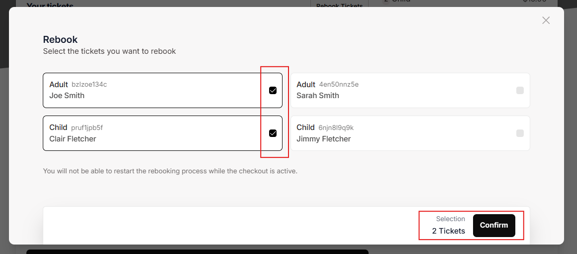 - Select the check box next to required tickets to be rebooked, then click confirm