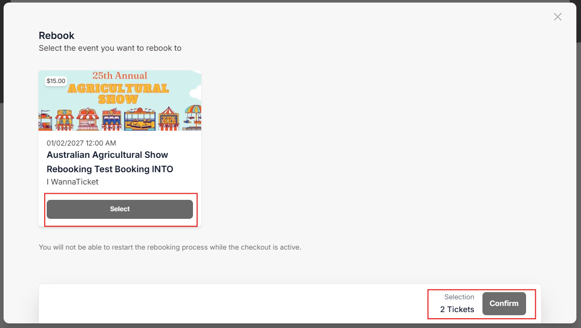 - Based on the event organiser’s settings, you will be presented with any approved events available for rebooking, click Select and then Confirm