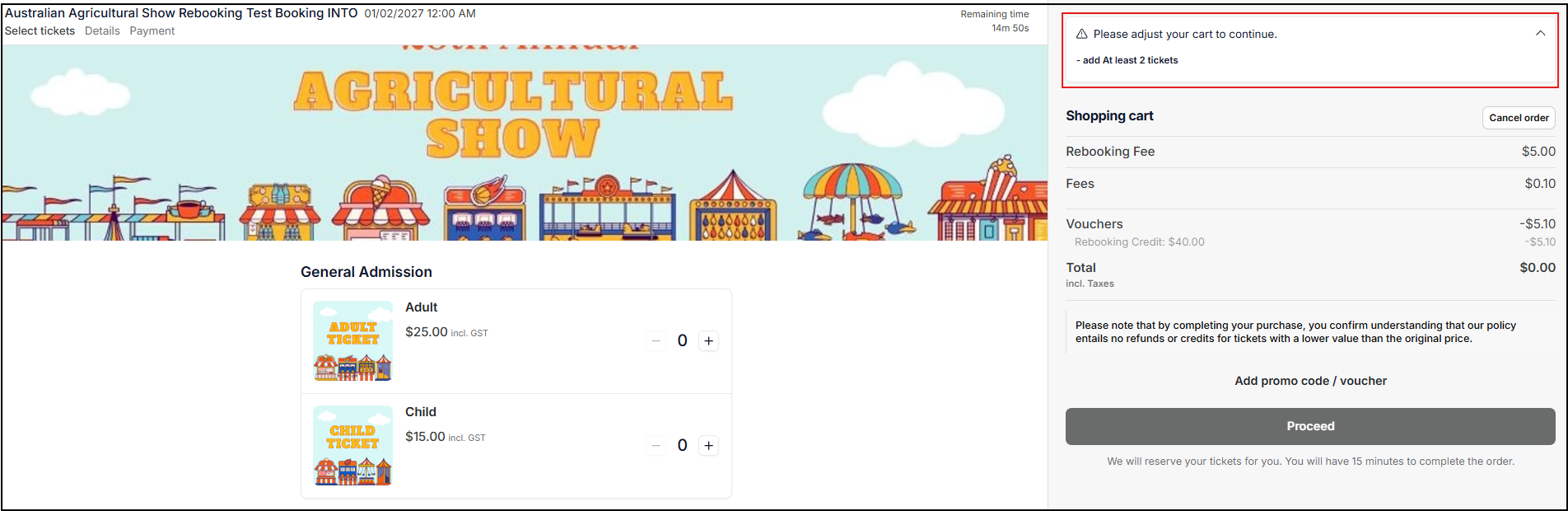 The value of the original tickets selected is credited to your cart as a voucher. Note: you must add the minimum required number of rebooking tickets to proceed. A notification will appear if this requirement has not been met.