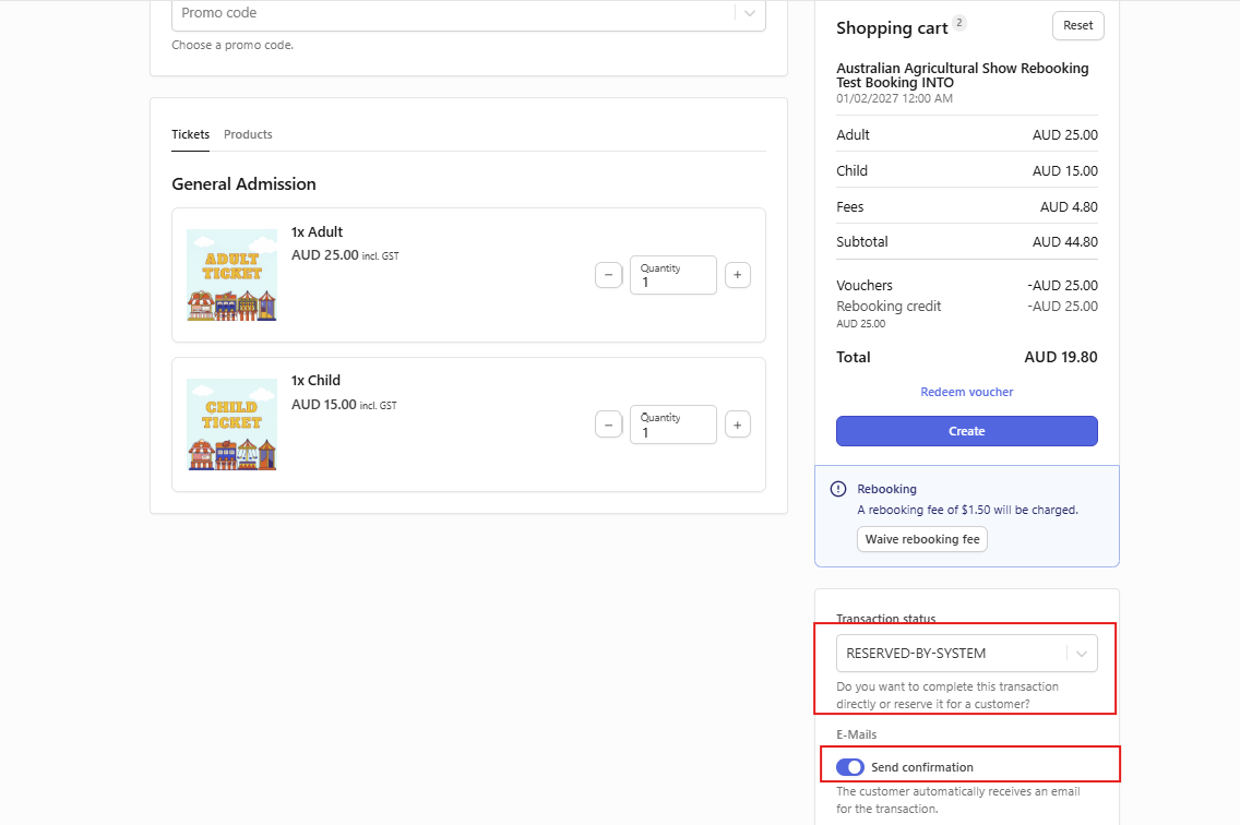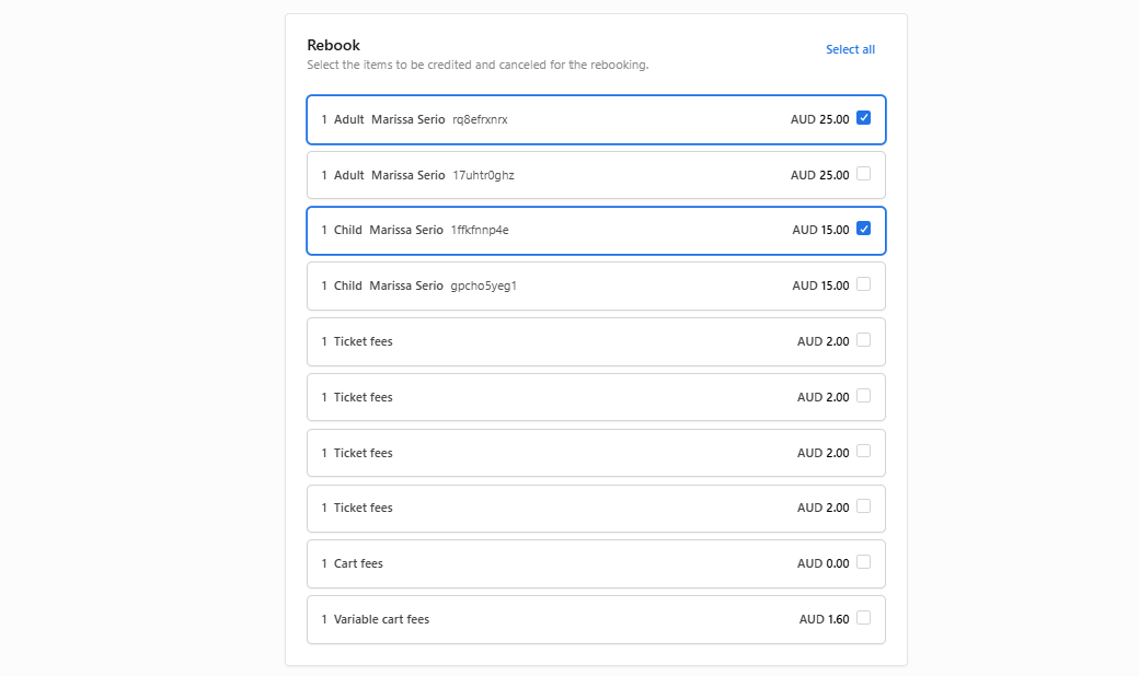 - The cart will now be calculated based on the price of the selected tickets minus the value of the previously selected items. If the value of the new tickets is higher, a payment will be required. If the value is lower, the cart will be set to $0. (reminder: a credit note for rebooking is not possible)
