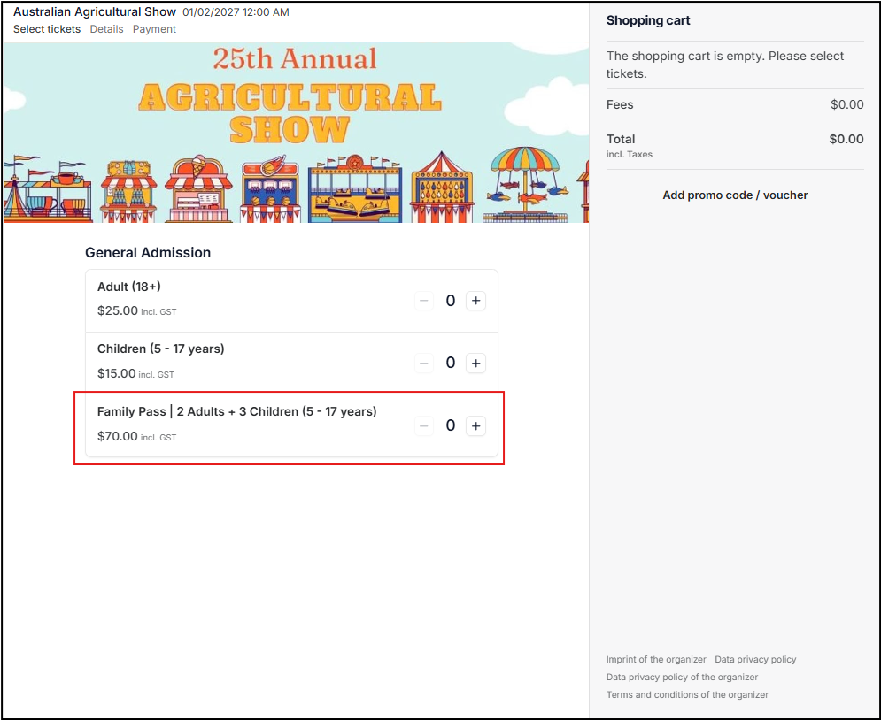 The lead ticket is created and priced as a group amount. The following automated tickets are set to $0.00 and enabled through cart automation. Cart automation can be set up in 2 ways: Fixed number of additions: The system can automatically add a 2nd Adult and 3 Child admissions. You can allow the customer to choose part/all of the automation: The system can can automatically add a 2nd Adult, then allow the customer to select between 1–3 Child tickets. This is particularly useful for sell-out events—some families may still purchase even if they only have 2 children. Automatically adding 3 Child tickets can use unnecessary inventory, whereas allowing the customer to choose helps maximise sales while still offering better value and flexibility. |